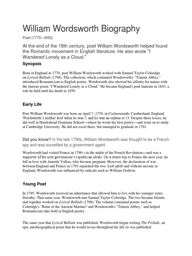 William wordsworth remains one of the most popular romantic poets. It is a conversational poem that contains elements of an. I wandered lonely as a cloud. William wordsworth was one of the founders of english romanticism and one its most central figures and important intellects.